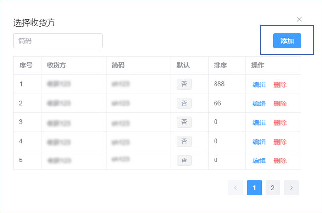 2、在彈出對(duì)話(huà)框右上角選擇“添加”,輸入收貨方名稱(chēng),自動(dòng)生成簡(jiǎn)碼,點(diǎn)擊保存;(可將該收獲方選擇為默認(rèn),默認(rèn)狀態(tài)下自動(dòng)填充表單;)