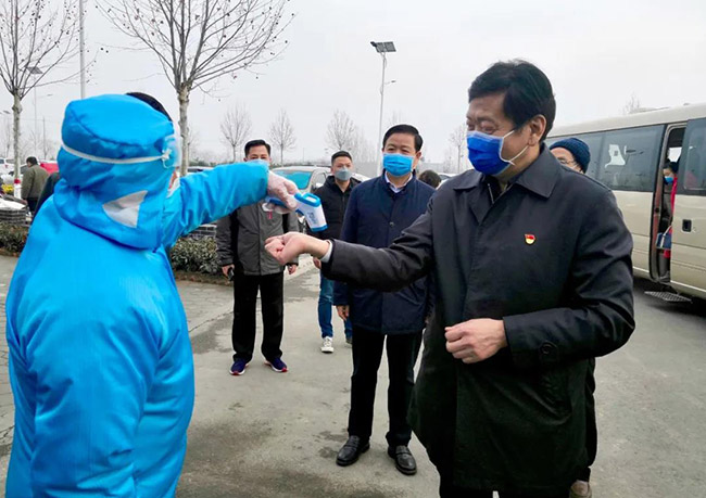 體溫檢測(cè)后進(jìn)入中譽(yù)鼎力智能裝備公司廠區(qū)